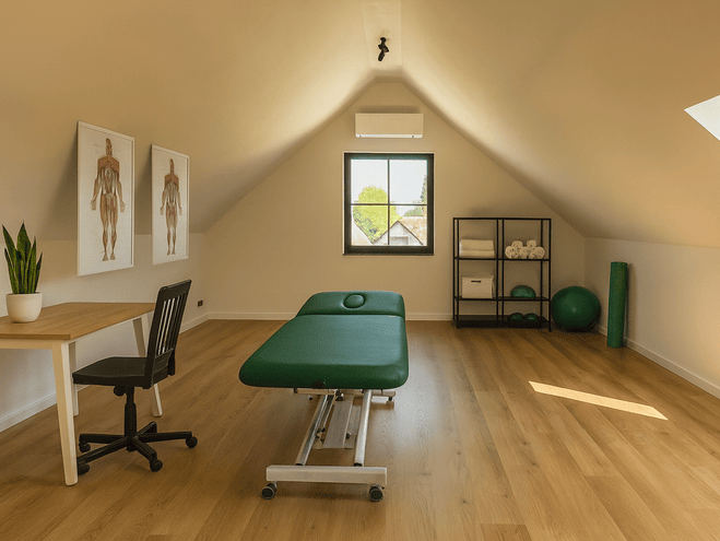 De zolder van een bestaande woning werd omgebouwd tot praktijkruimte voor een kinesitherapeut.